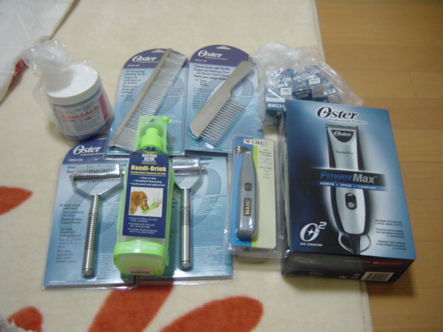 オースターパワーマックス 業務用の中では軽い部類で使いやすそうな点で選択しました 標準で1.6mm刃が付属します 業務用なのでいろんなカット長の刃に交換できますが,それはそれで高いです なのでスナップオンコーム6個セットを購入 後付けでカット長を変更します 装着方法は,コームの金属部分をバリカンの刃の後ろに引っ掛け,グイッと前に出すと金属部分がスライドし,刃先に引っ掛けるだけ バネの力で保持されます 次はスタイリークトリマー つま先等の細かい部分用です あんまり必要じゃなかったんですがついでに購入 後部にブラシが格納されます,こういうの好きですね エクステンドライフ バリカンの洗浄,給脂,クールダウンを行うもので,バリカン使用後に直接このボトルにつっこんでメンテするようです あとは散歩用ウォーターボトルを購入 バリカンのおまけにオースターのコーム2種,アンダーコートを切るコートキング2種が付いてきましたが,うちでは使いそうにないものでした 気になる通販価格です(参考日本通販価格) OSTAR Power MAX $119 (32550円) Wahl Stylique Trimmer $9 (2940円) Snap-On comb set $14 (4200円) Extend A Life $7 (2100円) Handi Drink $4.5 (1000円) Processing fee(手数料) $9 Shippinng $39 TOTAL $201 日本で買ったら総額4.3万円 今回はものすごく安い買物が出来て大満足です PetEdgeにwebオーダーして約10日で届いたし,お奨めです! でもまぁ,バリカン買う人なんて少ないよなぁ