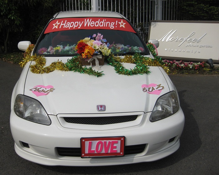まずは恒例のボードはこんな感じで使って頂きました! そんでもって,車のデコレーションもこんな感じに仕上がりました バンパーが物足りなかったなぁ これで今年予定の結婚式は終了!
