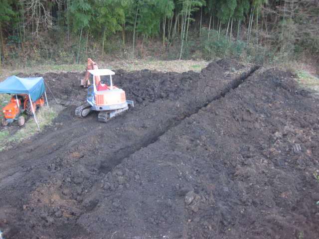 というのは,隣の空き地を畑にするらしく,ショベルカーが入ってます そいつを使って良いってことになったのです いいですねぇ,重機があるって 土曜日の成果 全面掘り起こしとど真ん中に暗渠排水用の溝を掘りました 日曜日 朝から竹を10本ほど切り出し,敷き詰めます これを埋め戻して,全体をならしたら踏み固まっちゃったので再度掘り返し 重機じゃないと掘り出せないようなガラも幾つか出てきて,助かりました 丸二日やっても軽油30リットルって,結構燃費いいねぇ お隣さんは施設関係で畑をやるとのことでしたが,このショベルカーは個人所有だそうで しかもブルとかもあるらしい さらに5年かけて自宅を作ったとかで,なんとも凄い人と出会いました これからはいろいろお世話になりそうです 早速明日はトンプンが大量に搬入されるのでおこぼれを頂く予定です たぶん2トンほどになるでしょう