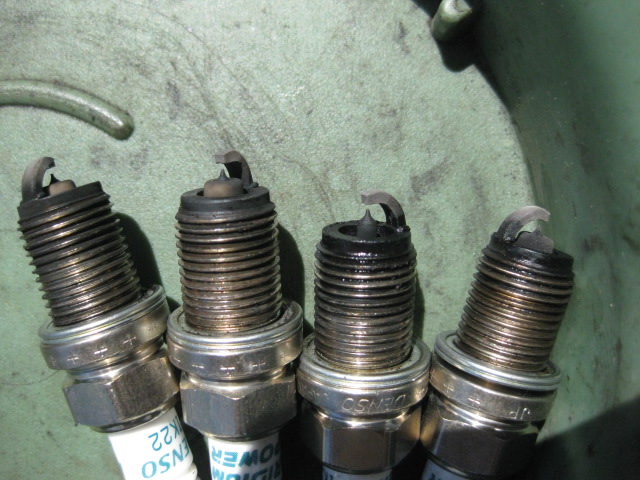Rotrex装着後初走行なので楽しみでしたが,2枠走ってかろうじて50sを切るレベル ??? 確かに乗ってて速くない まだログ検証してませんが,3速で走行中に見たAFRも10以下とかなりリッチ Maxスピードも140km/hに届かずNAと同じ・・・・・ 3速での安全マージンがありすぎるんでしょうねぇ,と言う意味で燃調を取る必要あり 1-2速は抜群なんですが,サーキットだとほとんど意味ないから,タイムに現れにくいんでしょうね で運命の3枠目 やっぱタイム出したいよねってことで,少し冷静に走ろうと思ってたのですが・・・・ アタック開始直後,白煙発生 ためしにアクセルパコパコすると煙もパフパフ出やがります あーれー・・・・・いや実は2枠目にちょっといやな感じがあったんです 思い返せば2枠目 クール走行でも油温が下がらないのに終了時間間際だったので,連続走行したのでした そのときメータが130℃オーバだったと記憶してます(その後ピークホールドに気がついて見たら140℃) 直後変な感触だったのですが,チェックするとよくわからず気のせいかな?と思った次第 とりあえず自走できる状態だったので早々に退散 まぁあんまりショックではないけど,どうしよっかなぁと悩むこと一晩 改めて調べると中古1ZZは8万くらいで入手できそう 載せ換えるか否か悩むところですが,まず自分でできるのかを確認する必要あり(笑) せっかくの機会なのでバラさなきゃ まずはプラグチェック 写真は気筒順に並べてますが,右二つにオイル付着あり この先写真ないですけど,インテークには結構オイルが回ってて,クリーナやらS/C内部やらべとべとでした これとは別にS/Cの不具合発見 これはトラクションオイルフィルターからS/C本体につながるオイルホースで,エキマニとエンジンの間を通ります ご覧のとおり,熱でテープどころかコルゲートまで溶けてます,ホースは大丈夫そうだが・・・ 20分のスポーツ走行は無理か?遮熱材でも巻きつけないと怖いです ちなみにトラクションオイルの吹きこぼれはありませんでした あとは,パイプの干渉などが少しあるもののS/Cシステムは問題なし 今日のところは,エンジンにつながるホースやハーネスを全て外せるかを実践してみたところ,残すはマウントだけの状態まで完了,やればできるもんだな 足回りやらミッション周りも全て取り外し,液体もガソリン以外は抜き取り完了,あとはミッション→エンジンの順に下ろすだけまで進みました 今日は,過去最大の作業量だったのにさくさく進んだなぁ,温かいから体が動くのか? と言うわけで,なんだかできそうな気がしてきたので進めていきます ですが,エンジン脱着に必要な器具をそろえるまではちょっと時間がいりそう 配送トラックからエンジンをどうやって降ろすかが最大の問題だったりするのよねぇ まぁ,こんな間抜けな話なので,本家ブログのこちらでレポートしていく次第です