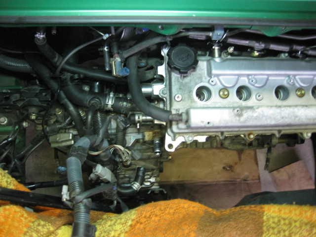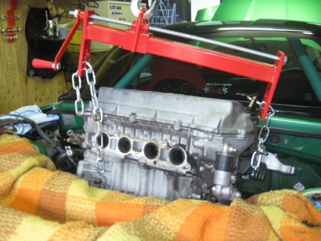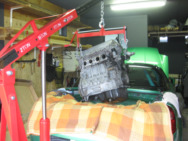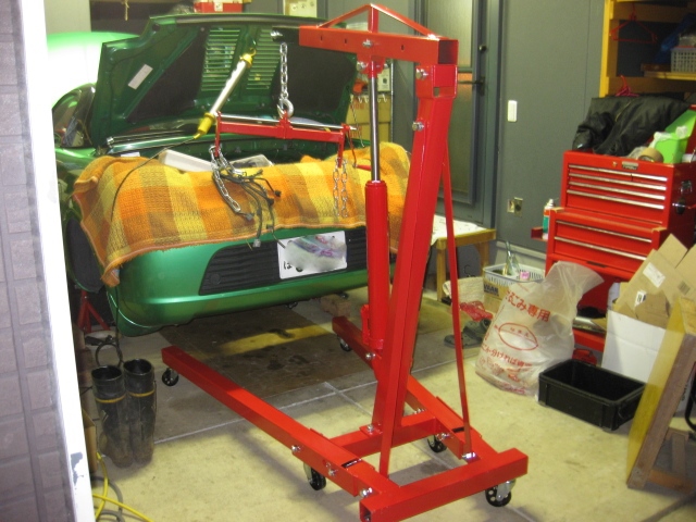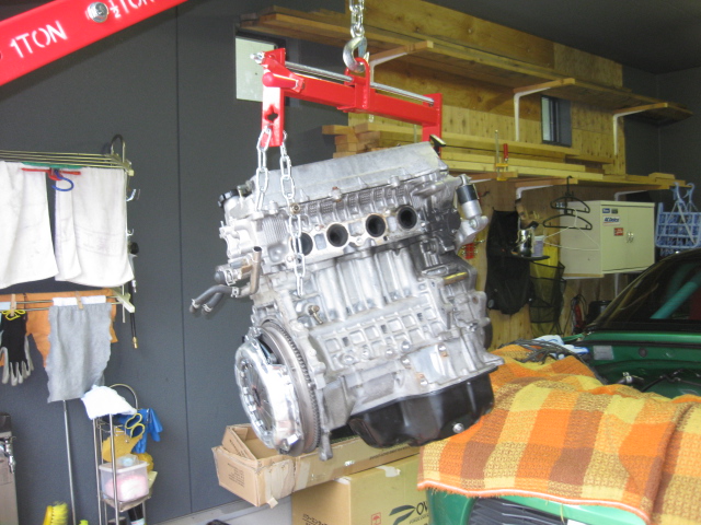 まずエンジンフードを外してみた これ,一人だと大変だよなぁと思ってたけど,クレーンがあれば楽勝 しかし,このあとに部屋に運び入れてたらずっこけて傷つけてしまったOrz 今年2回目のミッション降ろし クレーンでエンジン吊っての作業なので,いつもとちょっと手順が違うけど,さっくり降ろしました いよいよエンジンを吊り上げるのですが,どう見てもインテークが邪魔で上に抜けない もうひとつ,クロスメンバーも外さないと厄介でしたので,途中から取り外しました なので,インテークとオルタを取っ払いました インテークの真ん中にあるナットに気付かなくててこずったのは秘密です さあ,いよいよ吊り上げです じゃん じゃじゃん じゃーーーん! というわけで摘出成功 中古エンジンを手配しよう!! (トラックから降ろすのが非常に不安だ)