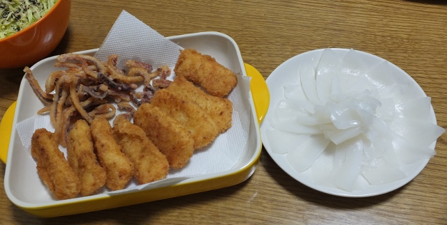今日はイカづくし,一夜干しのイカを細切りしたから揚げ,コウイカのフライ&刺身
