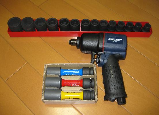 最も使用頻度が高いのはホイール交換だと思うのですが,今までは電動インパクトで用は足りたし,コスパが悪いんですよね 最近よく見かける安くてトルクの高い気になるインパクトがあり,思い切って買ってみた SIGNET65331 1/2SHでMaxトルク520Nm(φ10ホース時)です 1.1kgと軽量で小さく良い感じ 一部の通販サイトでは470Nm表記になっているのが??でしたがφ8ホース換算かな? 最後までKTCのJAP436と悩みましたが普段使いには重いしかっこ悪い(笑)610Nmは魅力でしたが 1/2SHなので,一緒にSIGNETのソケットセット Kokenの新型ホイール用ソケットセット ちょっとだけ良いやつ基準で選んでみました Kokenの表面処理は綺麗ですな 気になる実トルクを測ってみたのですが, レベル1=60Nm,レベル2=80Nm,レベル3=100Nm ホイールを締めるにはちょうど良い♪ なんておい,520Nmはどうした? 実は今使ってるエアホースはφ6.5なので,流量が足りないんです 結構落とし穴じゃないかなぁ,説明書には書いてあるけど通販サイトではまず書いてない感じ でね,このホースがφ8までは結構安いんです,10m2000円くらい φ10になると・・・見つからんorz ストレートで売ってるがカプラがない φ13の15mがカプラも含めて7000円くらいだけど,太いとかさばるしなぁ カプラの径ってφ7位なんで,実はφ8ホースで470Nmが一般的なのかもとも思うし(安く済むし) このままでは宝の持ち腐れなので,なんとか安いホースを探したいと思います PR