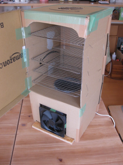 ドライフードとかローフードと言われる乾物を作る機械のことです こんなのが一般的 http://www.nesco.com/ ファンとヒータで熱風を送るやつです 欠点は電気代と単価が高いことかな 調べて行き着いたのがこれ http://www.rebran.com/index.php ここのエアドライってやつが売価1.8万円ほど しかも生ゴミ処理機扱いなので市の助成が半分出る(地域差あり)=実質0.9万円と安い ヒータレスなので電気代も300円/月程度 amazonでポチしようか悩んでたんですが,いつもの病気が・・・・ いつものDIYでございます エンジンはPC冷却用ファンを12V電源で駆動 1Wくらいなのでエアドライより低電力?実力不明 早速試運転 定番の大根とミニトマト うまくいきますでしょうか? 私自身はドライフードは得意じゃないのですが,先日買って来たドライトマトが激ウマ なんとか作れない?ってことと自家製野菜の保存ができそうってことでチャレンジ中 PR
