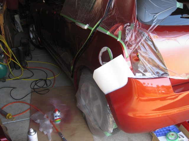 職人さんに調色してもらいました タイミング悪く現車あわせは出来ず,データ通りの調色となりました ドックインしてマスキング ベースカラー塗装完了 ここで失敗 表面をコンパウンドで磨いたところ,メタリックが露出&研磨傷付きまくり テストピースでは問題なかったんですが,触っちゃいけなかったのかも 再塗装して対応しましたが,焦った! 再びドックイン マスキングのパターンもクリア用に変更しています ここまでが土曜日の作業 夜ガレージ内でクリアスプレーを何度が実施しておきました 一晩明けて日光でチェック ちょっと赤味が強い感じになりましたがおおむね良好 コンパウンドで磨いてようやく完成しました 写真では凄く綺麗に見える(?)けど,肉眼で良く見るとムラなどあります 今回ほぼすべての材料を購入しましたが,かかった費用は8000円 プロの塗料の使用感最高でした その後のクリアは市販の缶スプレーだったので,吹きづらくイマイチな仕上がり 自分的には75点かなぁ(ほぼ満足) 色合わせで+10点 磨き作業で+10点 DIY技術で+5点のマージンがありそうです 楽しい作業でした