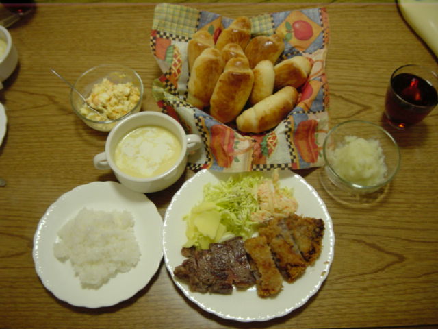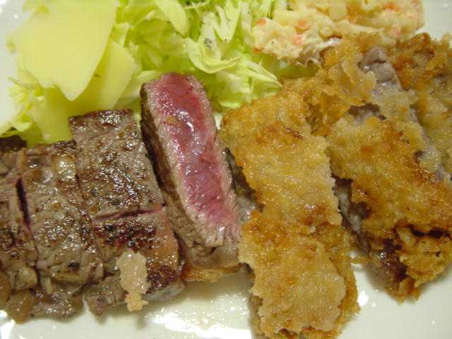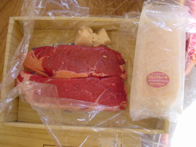 と言うのはオーストラリア在住の友人よりオージービーフサーロインステーキを頂きました! ピンク色のオリジナルソルトも付いて豪華! それとスモークチェダーチーズも頂きました 回りの黒いワックスを剥ぐと 小さくスライスして こいつは美味い 割と香りが強くて,ほのかな苦味がビールを飲みたくなります 特に癖があるわけではなくいわゆるおいしいチーズ 小ぶりで数があるので,ちびちび味わう私には長く楽しめてGood (もらっといて何を言う笑) サーロインは一つをガーリックステーキ もう一つはビーフカツにチャレンジしました 珍しく皿まで温めて盛り付け どうです,このレア カツの方は少々揚げ方を失敗,健康油をケチったのが原因 和牛と比較するとサシがないので,良く噛み締めて味わうタイプですね ガッツリ肉食べてるーって感じで美味いなぁ ギトギト感がなくて脂くさくなく,オージービーフいいねぇ カツの方は一度高級肉でやってみたかった(つーか,安肉じゃ硬いだろう) 衣で包むと肉のうまみが閉じ込められるので,より香りを楽しめます ステーキよりも美味いかもね 衣が割れてうまみを逃がしたにもかかわらず,ステーキより良かった 少々油っぽくなったのと,日の通り加減がわからず揚げたときはピンクだったが余熱で中まで火が入ったのが残念 それからロールパンを奥様が手作りに初挑戦 焼きたては最高に風味があっていいですなぁ 我が家の定番になれるかな?(結構手間がかかるので) と言うわけで数年に一度の豪華ディナーになり,感謝感激です ご馳走様 PR